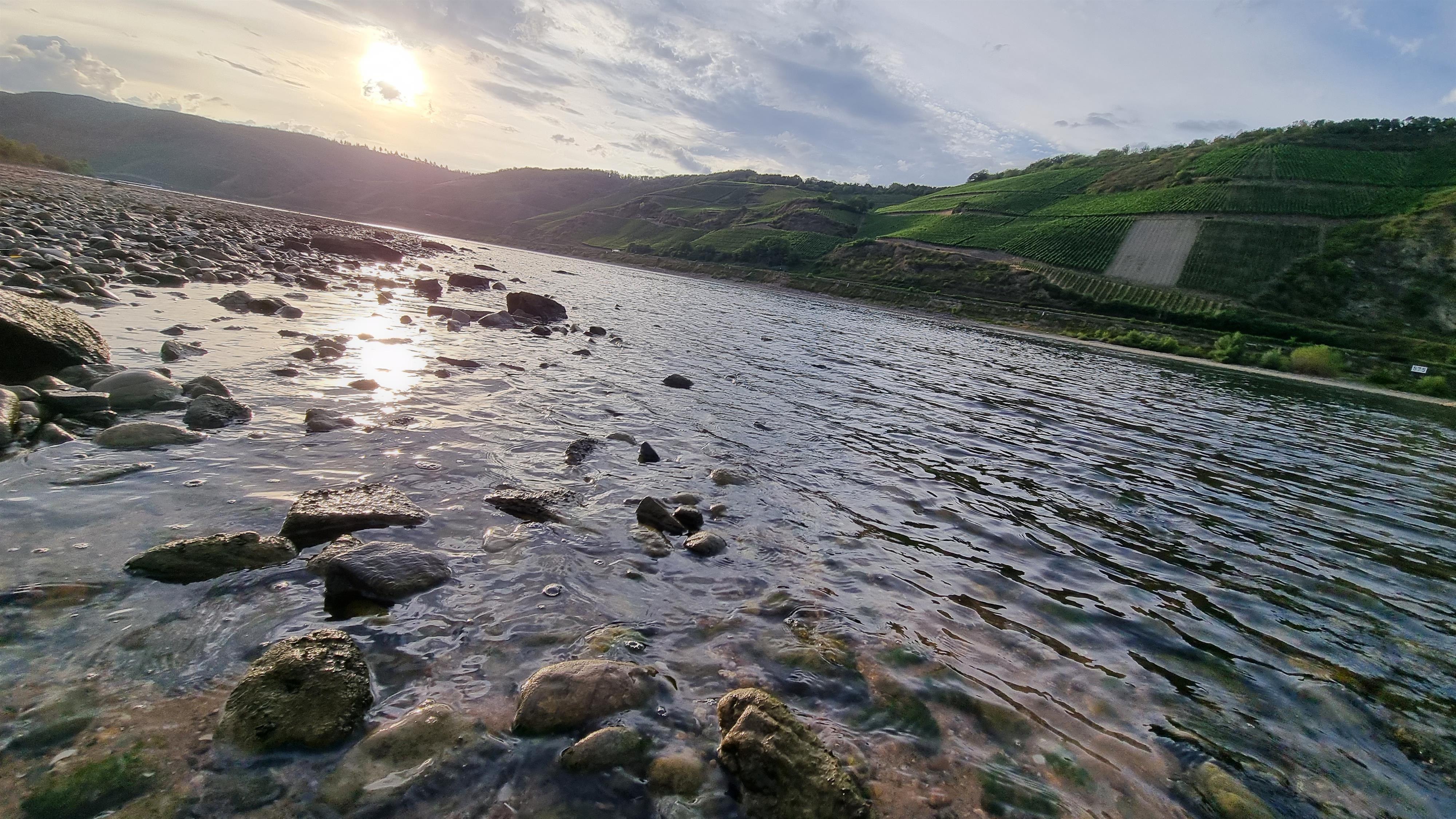 Der feine Rheinsand von Osterspaiern auch "Osterspaier Ritt" genannt, lädt zum Sonnenbaden ein. Im kühlen Nass finden die Beine Erfrischung, während an anderer Stelle ein Angler auf sein Glück wartet, das oft der hier anzutreffende Kormoran schon erfolgreich eingefordert hat.