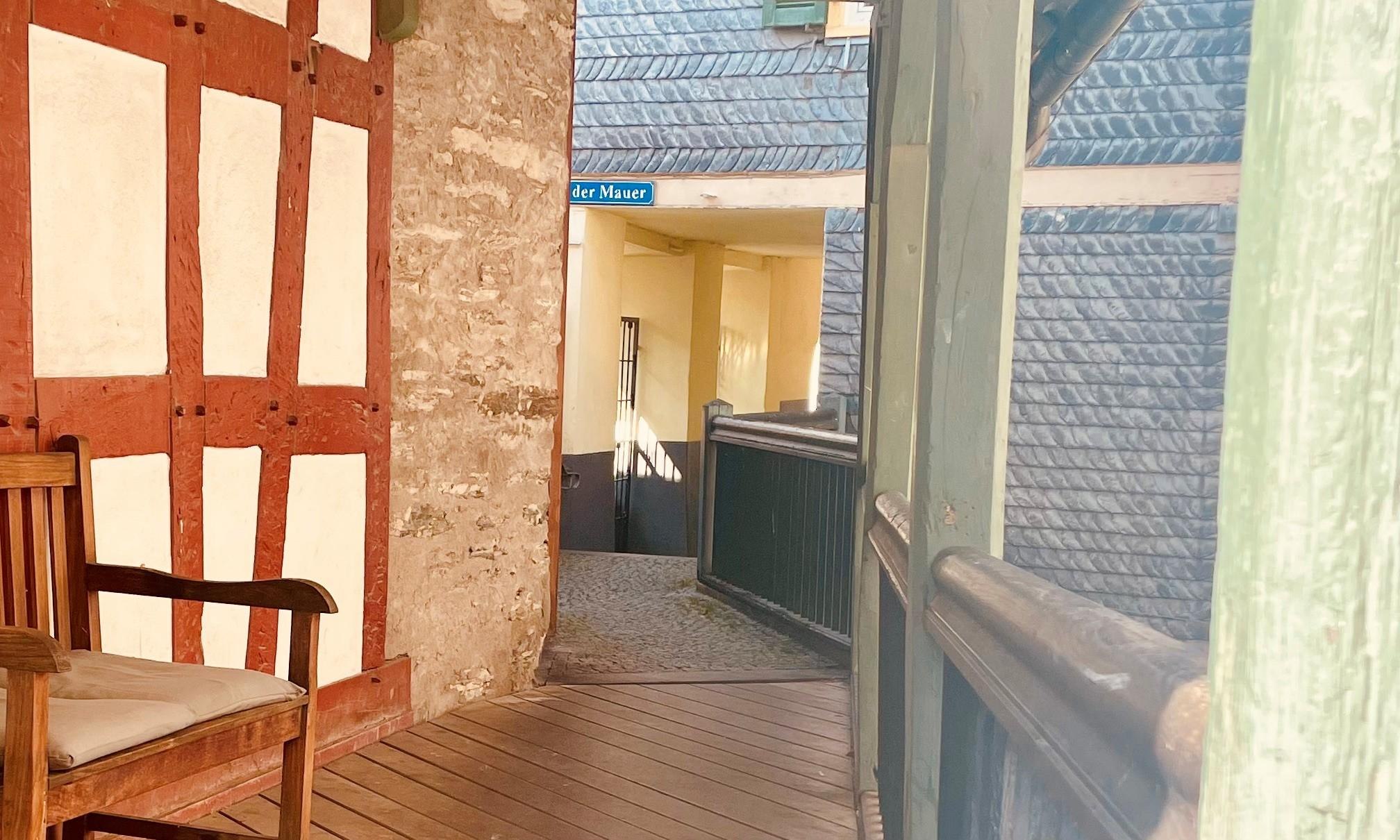 The city wall was probably built in the 1st half of the 13th century, at the same time as the castle. The oldest fortification secured the "city quarter" from the church to the Mainz Gate Tower. The Rhine front was probably already built on the inside with residential houses since the 13th century; the building over of the fortification corridor took place only since the 17th/18th century.