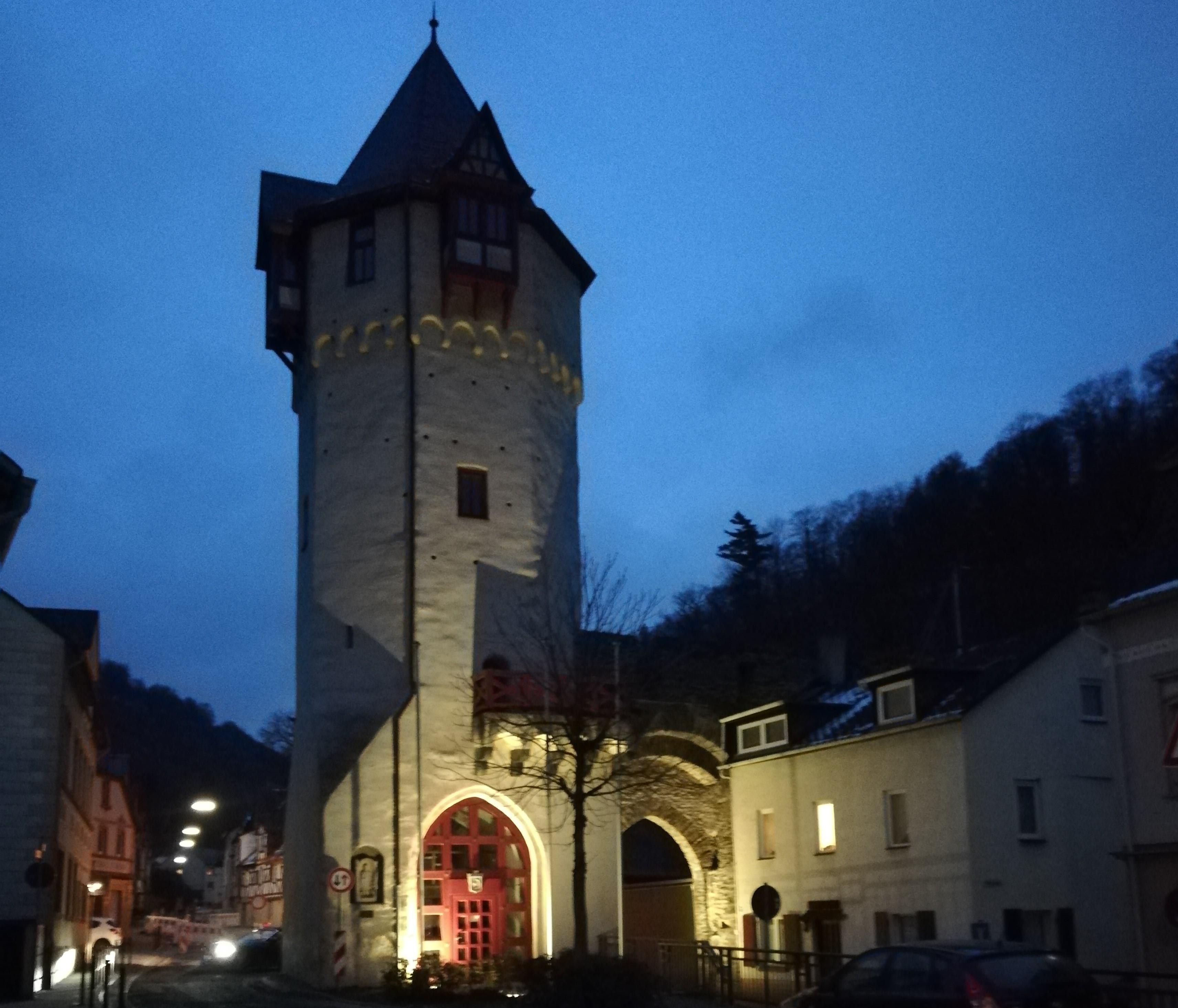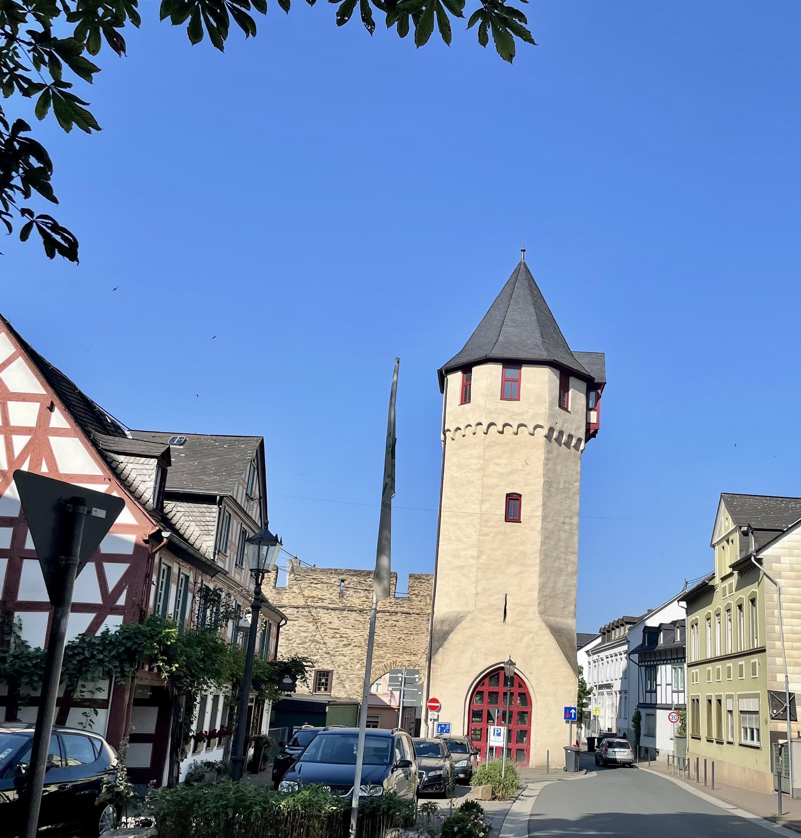 From this gate tower at Unteralleestraße 28, the city wall, which enclosed the oldest part of the city around 1200, led up to the castle hill. The Upper Gate was the easternmost gate of the city wall and an important checkpoint to the trade route to Wiesbaden. Parts of the city wall can be seen between Oberalleestraße and Unteralleestraße. The Obertor tower is one of two former towers in this area. The tower received changes around 1900, when a passage was broken into the tower during the construction of the Nassauische Kleinbahn. After the lead and silver smelter switched transportation to trucks, the Kleinbahn was sold to Switzerland and the Obertor was rebuilt. Today, traffic flows around this gate. There is a meeting hall in the top of the tower that can be rented.